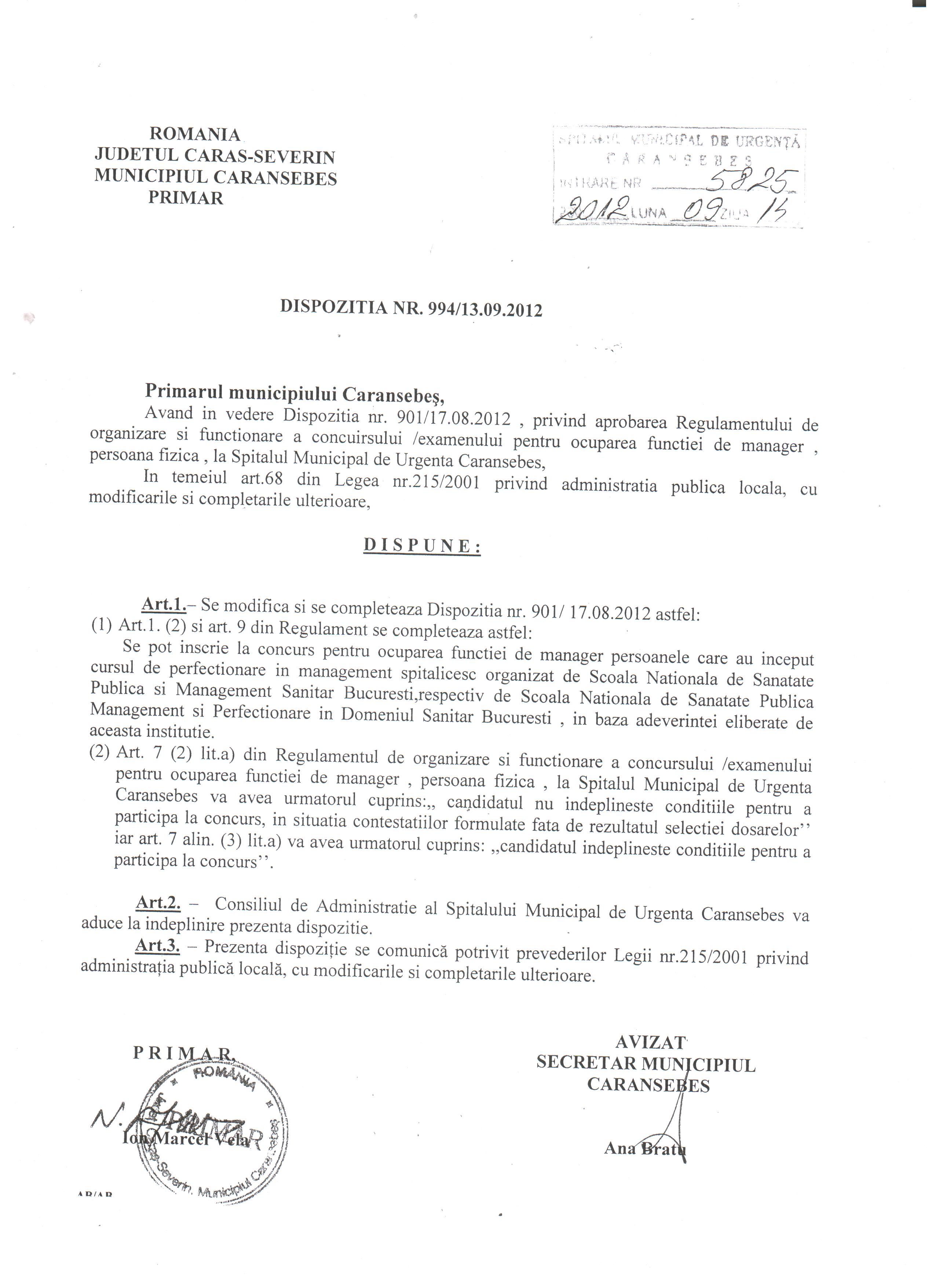 Primăria municipiului Caransebeş organizează concurs, în intervalul 25.02-27.02.2013 în vederea ocupării funcţiei publice vacantă de Director executiv în cadrul Serviciului Public Poliţia Locală Caransebeş